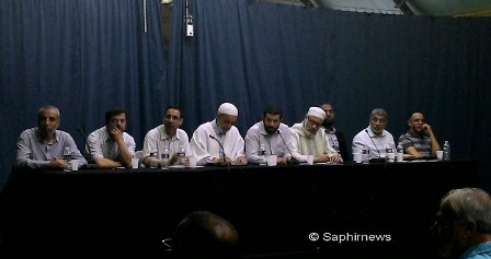 Les intervenants à la réunion, autour du recteur de la mosquée Adda'wa, Larbi Kechat, entouré d'Ahmed Jaballah (UOIF) et Fatih Serikir (Mili Görus).