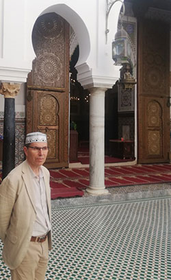 Abd-al-Haqq Guiderdoni devant l’entrée de la mosquée renfermant le mausolée de Moulay Idris II, fils de Moulay Idris 1er, descendant du Prophète Muhammad, fondateur de Fès et de l’émirat idrisside.