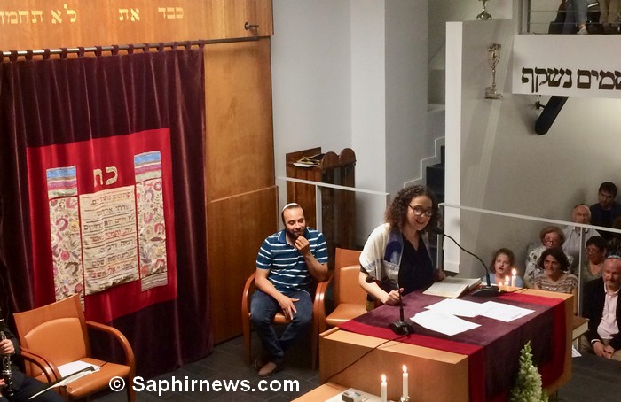 Le rabbin Delphine Horvilleur et le comédien Ismaël Saïdi, ici à la synagogue du 15e arrondissement de Paris le 1er juin, ont initié le Shabaddan, pour inviter juifs et musulmans de célébrer Shabbat et le mois du Ramadan ensemble.