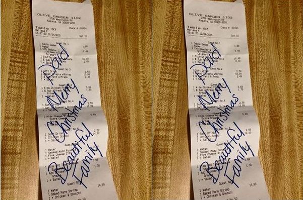 Une famille américaine de sept adultes et de cinq enfants dînaient la veille de Noël lorsqu’un autre client s’est présenté à la caisse pour leur payer l’addition. Il ne laisse aucun indice quant à son identité. Seul un mot est laissé sur la note « Paid. Merry Christmas beautiful family » comme en témoigne le ticket pris en photo puis posté par Eslam Mohamed sur sa page Facebook.