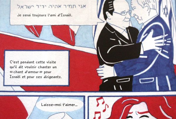La BD, extrêmement bien documentée, vient d'abord plonger le lecteur dans les origines du conflit et ainsi en saisir des raisons objectives. Du général de Gaulle et la rupture de l'alliance française avec Israël, à François Hollande et son « chant d'amour » pour l'Etat hébreu, l'ouvrage explique avec pédagogie l'évolution – et, plus intéressant, les coulisses – des relations avec Israël, jusqu'à aboutir aujourd'hui à une idylle qui se poursuit avec l'arrivée au pouvoir en France d'Emmanuel Macron, et ce au détriment des Palestiniens que la promesse de reconnaissance de leurs droits tarde encore et toujours, 68 ans après la Nakba.