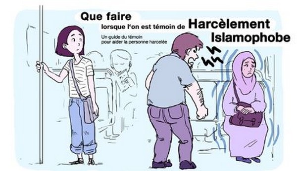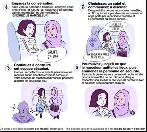 Une bande dessinée en quatre cases publiée fin août sur les réseaux sociaux indique la marche à suivre lorsqu’on est témoin d’une scène d’harcèlement islamophobe. Son auteur, la dessinatrice Maeril, a illustré son propos en dessinant une femme dans le métro qui voit un homme injuriant une femme voilée. L'étudiante en graphisme conseille, en quatre étapes, de protéger la victime en lui servant de bouclier, ceci en ignorant l’harceleur.