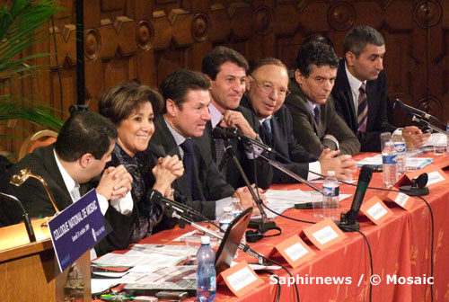 Plus de 400 personnes ont assisté aux tables rondes organisées par Mosaïc, le 31 octobre, à Nice. Ici, la table ronde « Français et musulman ». De g. à dr.:Robert Djellal, conseiller auprès du ministre de l’Immigration, de l’Intégration et de l’Identité nationale ; Bariza Khiari, sénatrice ; Christian Estrosi, ministre chargé de l’Industrie, maire de Nice, président de Nice-Côte d’Azur ; Marouane Bouloudhnine, président de Mosaïc ; Dalil Boubakeur, recteur de la Grande Mosquée de Paris ; Mohamed Abdi, conseiller spécial de Fadela Amara ; Fayçal Douhane, président de l’association La France est en nous, directeur général adjoint de l’AMIF (Association des maires d'Île-de-France).