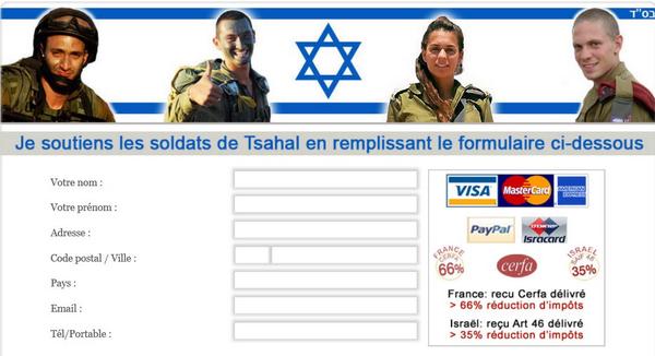 Si l'information sur les réductions d’impôts était mise en avant sur le formulaire, ce n’est plus le cas actuellement. Cette mention y a été effacée mais elle reste indiquée sur le site de l’association, remarquons-nous vendredi 25 juillet. Face au tollé, Tsidkat-Eliaou souhaite jouer la carte de la discrétion. Trop tard. Que nos impôts financent, directement ou non, des actions en faveur de l'armée israélienne ne saurait être acceptable.
