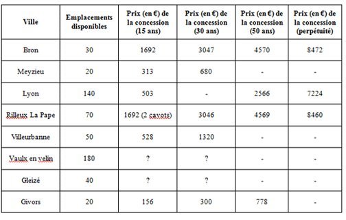 Le tableau 2 regroupe l’ensemble des carrés musulmans dans le département du Rhône avec le nombre de sépultures encore disponibles et les prix des concessions pour 15 ans et 30 ans.